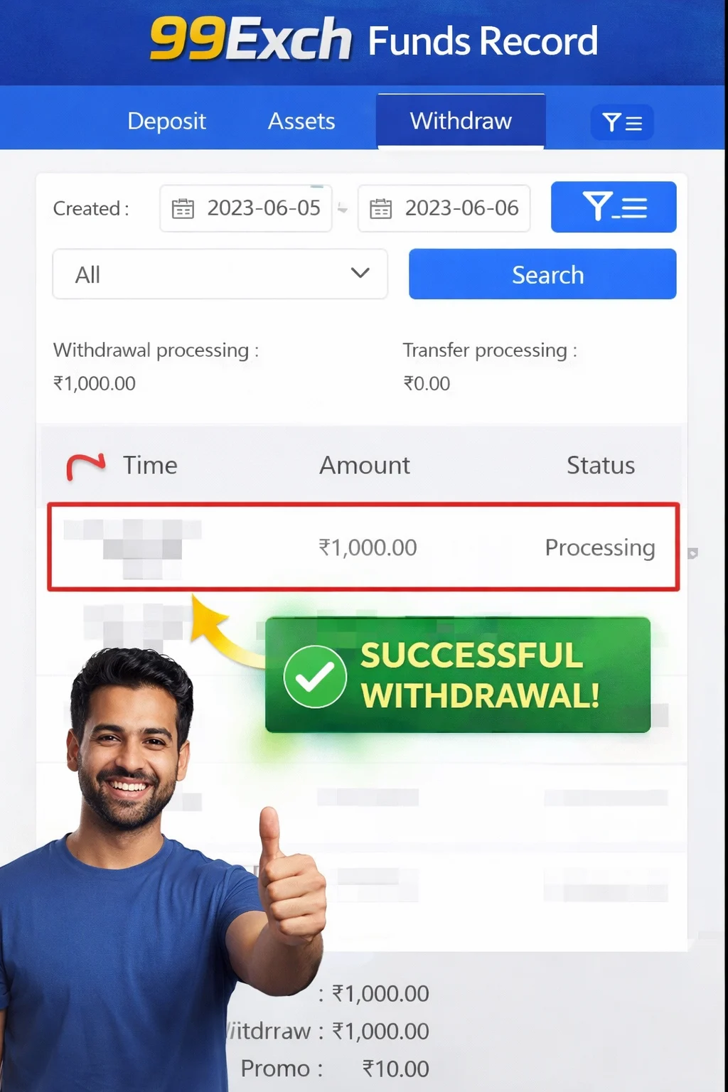 “WITHDRAWAL – 5,000 – 99exch ID: xxxxx”